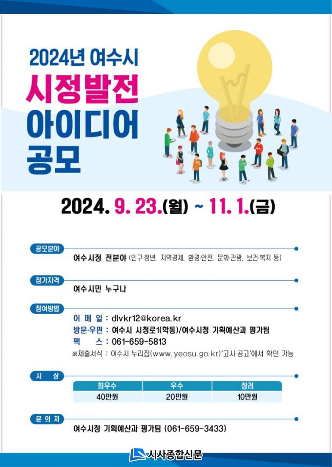 ¿©¼ö½Ã ¹ßÀü¿¡ °ü½É ÀÖ´Â ½Ã¹ÎÀ̶ó¸é ´©±¸³ª Âü¿©ÇÒ ¼ö ÀÖ´Ù. Âü¿©Èñ¸ÁÀÚ´Â ¿À´Â 11¿ù 1ÀϱîÁö ¿©¼ö½Ã ´©¸®Áý(www.yeosu.go.kr) °í½Ã¡¤°ø°í¸¦ Âü°íÇØ ÀüÀÚ¿ìÆí(dlvkr12@korea.kr) ¶Ç´Â ÆÑ½º(061-659-5813), ¹æ¹®, ¿ìÆí µîÀ¸·Î Á¦¾È¼¸¦ ºñ·ÔÇÑ ±¸ºñ¼·ù¸¦ Á¦ÃâÇÏ¸é µÈ´Ù.