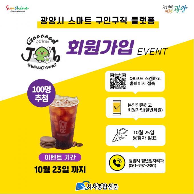 ȸ¿ø°¡ÀÔ À̺¥Æ®´Â ±¤¾ç½Ã ½º¸¶Æ® ±¸Àα¸Á÷ Ç÷§Æû(https://job.gwangyang.go.kr)¿¡ Á¢¼ÓÇØ ÀϹÝȸ¿øÀ¸·Î ȸ¿ø°¡ÀÔ¸¸ Çϸé ÀÚµ¿ ÀÀ¸ðµÈ´Ù. Ã롤â¾÷À» Èñ¸ÁÇÏ´Â ±¸Á÷ÀÚ ¶Ç´Â ±¤¾ç½ÃÀÇ °ø°ø¡¤¹Î°£ ÀÏÀÚ¸® Á¤º¸¸¦ ¾Ë°í ½ÍÀº ½Ã¹ÎÀ̶ó¸é ´©±¸³ª Âü¿©ÇÒ ¼ö ÀÖ´Ù.