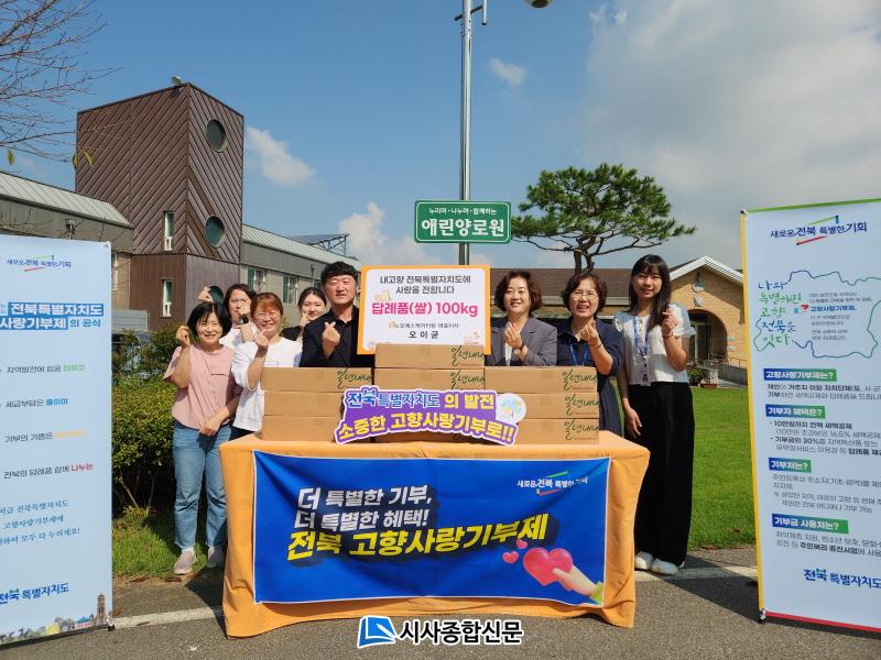 ¿ÀÀÌ±Õ ´ëÇ¥ÀÌ»ç´Â Áö³ 8¿ù 30ÀÏ ÀüºÏƯº°ÀÚÄ¡µµÃ»À» ¹æ¹®ÇØ °íÇâ»ç¶û±âºÎ±Ý 100¸¸¿øÀ» ±âºÎÇßÀ¸¸ç, °íÇâ»ç¶û±âºÎÁ¦¸¦ ÅëÇØ ¹ÞÀº ´ä·ÊǰÀÎ ½Åµ¿Áø ½Ò 100kgÀ» ±èÁ¦¿¡ À§Ä¡ÇÑ ¾Ö¸°¾ç·Î¿ø¿¡ Àü´ÞÇϱâ·Î Çß´Ù.