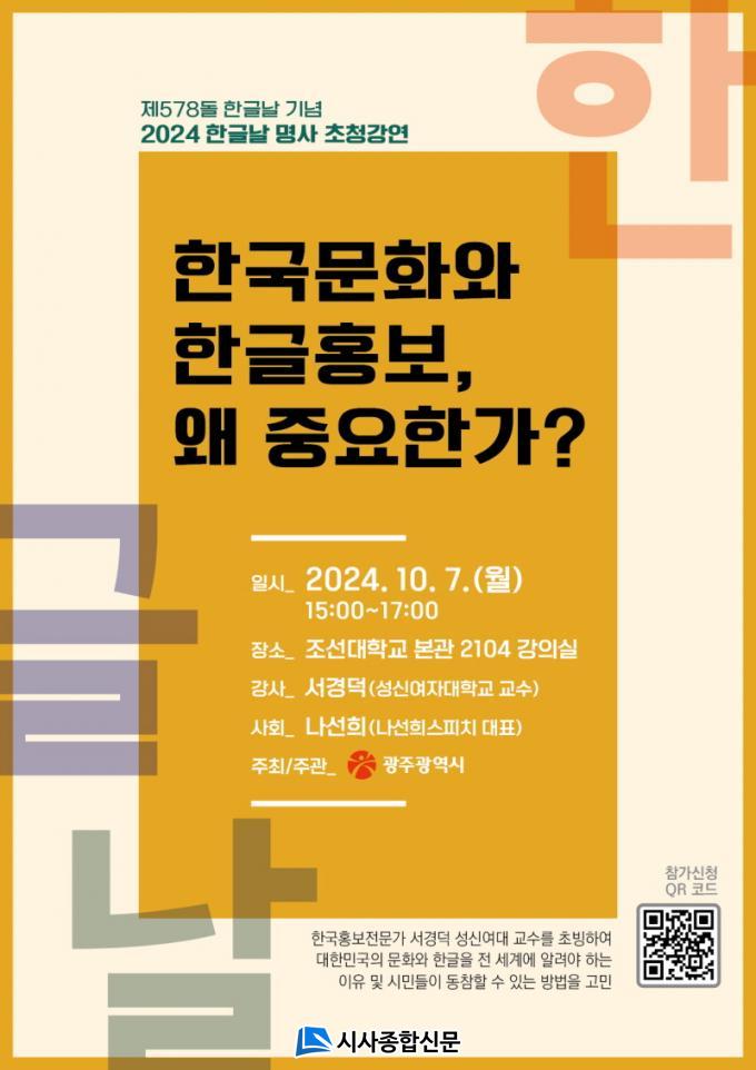 À̳¯ °¿¬Àº ¼°æ´ö ¼º½Å¿©ÀÚ´ëÇб³ ±³¼ö°¡ ¡®Çѱ¹¹®È¿Í ÇÑ±Û È«º¸, ¿Ö Áß¿äÇѰ¡?¡¯¸¦ ÁÖÁ¦·Î ´ëÇѹα¹ÀÇ ¹®ÈÀû ÀÚ»êÀÎ ÇѱÛÀ» ¼¼°è¿¡ ³Î¸® ¾Ë¸®°í, Çѱ¹ÀÇ À§»óÀ» ³ôÀÌ´Â ¹æ¹ý¿¡ ´ëÇØ ±íÀÌ ÀÖ´Â ÅëÂûÀ» À̾߱âÇÑ´Ù.