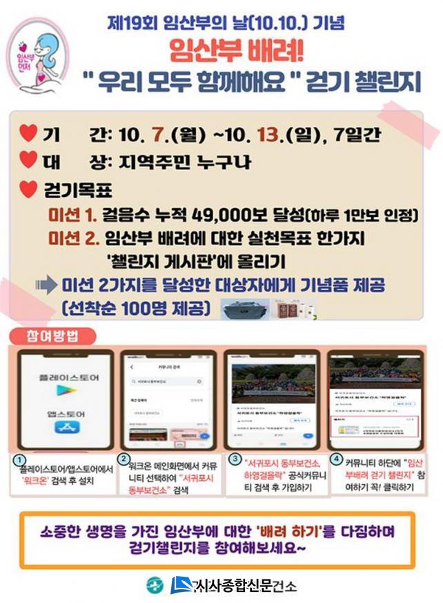 10¿ù 7ÀϺÎÅÍ 13ÀϱîÁö 7Àϰ£ ÁøÇàµÇ´Â °È±â縮Áö´Â ¿öÅ© ¿Â(walk on) ¾ÛÀ» ÅëÇØ Áö¿ªÁֹΠ´©±¸³ª Âü¿©°¡ °¡´ÉÇϸç, Âü¿©±â°£ µ¿¾È ¸ñÇ¥ °ÉÀ½ ¼ö 49,000º¸¿Í ÀÓ»êºÎ ¹è·Á ½Çõ¸ñÇ¥¸¦ °Ô½ÃÆÇ¿¡ ÀÛ¼ºÇÏ´Â ¸ñÇ¥ ´Þ¼ºÀÚ¿¡ ÇÑÇÏ¿© ¼±Âø¼ø 100¸í¿¡°Ô ±â³äǰÀÌ Á¦°øµÈ´Ù.