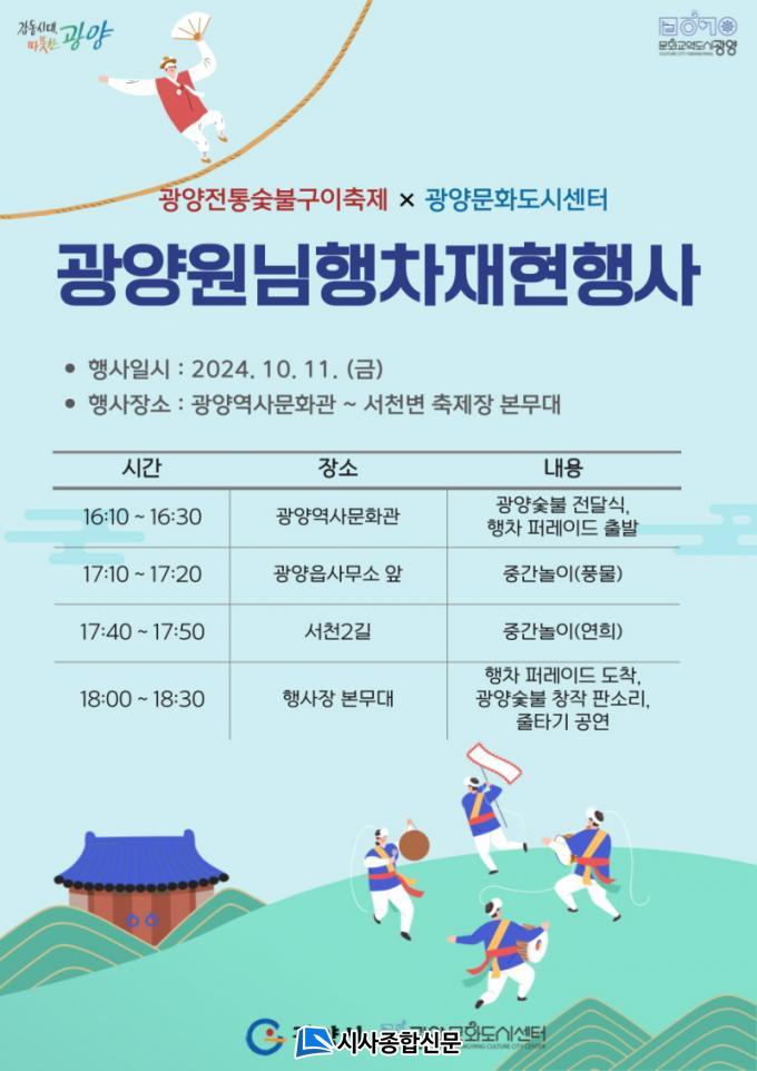 ƯÈ÷ ÃàÁ¦ÀÇ °³¸·½Ä »çÀüÇà»çÀÎ ¡´¿ø´ÔÇàÂ÷ ÀçÇöÇà»ç¡µ´Â ½Ã¹Î·ÂÀÇ ¹é¹Ì¶ó ÇÒ ¸¸Å, ½Ã¹ÎÀÌ Á÷Á¢ ±âȹÇϰí ÁøÇàÇÏ´Â ÇÁ·Î±×·¥ÀÌ´Ù. ±¤¾ç¹®Èµµ½Ã¼¾ÅÍ´Â ±¤¾çÀ¾ Àμ¸® ÀÏ´ë ¡®¹®È¿ø´Ô±æ¡¯ Ȱ¼ºÈ¸¦ À§ÇØ Áö³ 2022³âºÎÅÍ ½Ã¹Îµé°ú °¢¾ç°¢»öÀÇ ³íÀÇ ¹× ½Ãµµ¸¦ ÇØ¿Ô´Ù. ±×¸®°í À̸¦ ¹ÙÅÁÀ¸·Î 2023³â¿¡´Â ¸Å¿ù ¡´¿ø´ÔÇàÂ÷ ÀçÇöÇà»ç¡µ¸¦ ½ÃÇàÇßÀ¸¸ç 2024³â ¿ÃÇØ´Â À̸¦ ´õ¿í È®ÀåÇØ ½¡ºÒ±¸ÀÌÃàÁ¦¿Í ¿¬°è, »çÀü Çà»ç·Î ÁøÇàÇÏ°Ô µÆ´Ù.