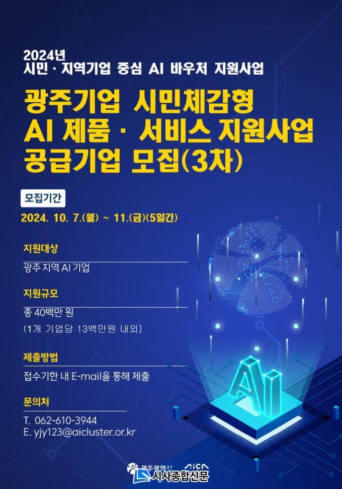 ÀΰøÁö´É(AI) ¹Ù¿ìó Áö¿ø»ç¾÷ÀÇ Âü¿©¸¦ Èñ¸ÁÇÏ´Â ±¤ÁÖ ÀΰøÁö´É±â¾÷Àº ¿À´Â 11ÀϱîÁö ÀΰøÁö´É»ê¾÷À¶ÇÕ»ç¾÷´Ü ´©¸®Áý(http://www.aica-gj.kr)À» ÅëÇØ ½ÅûÇÏ¸é µÈ´Ù. Áö³ 1, 2Â÷ ¸ðÁýÀ» ÅëÇØ ÃÑ 28°³»ç Áö¿ª ÀΰøÁö´É±â¾÷ÀÇ ´Ù¾çÇÑ Á¦Ç°°ú ¼ºñ½º¸¦ ¼±º¸¿© ½Ã¹Îµé¿¡°Ô Å« °ü½ÉÀ» ¹Þ¾Ò´Ù.