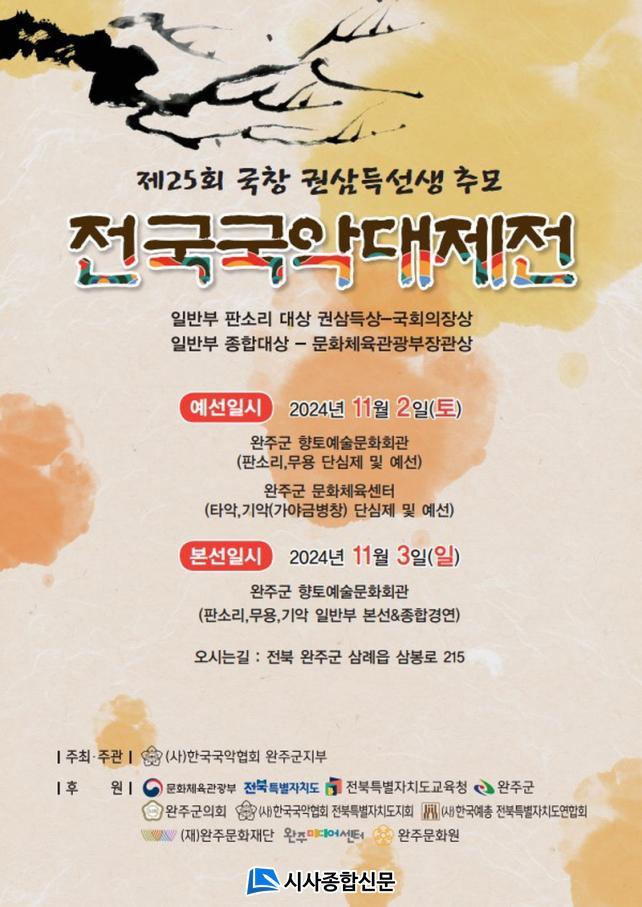±¹Ã¢ ±Ç»ïµæ Ã߸𠱹¾Ç´ëÁ¦ÀüÀº (»ç)Çѱ¹±¹¾ÇÇùȸ ¿ÏÁÖÁöºÎ ÁÖ°üÀ¸·Î ¿¸®¸ç, ù³¯ÀÎ 1ÀÏ¿¡´Â ±Ç»ïµæ ¼±»ý Ã߸ðÁ¦°¡ ¿ëÁøÀ¾ »ý°¡ÅÍ¿¡¼ ¿¸®°í, dz·ù´ëÀå ÄܼƮ°¡ ¿ÀÈÄ 7½Ã 30ºÐ ¿ÏÁÖ±º Ã౸Àå¿¡¼ ¿¸°´Ù.