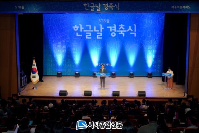 ¡®578µ¹ Çѱ۳¯ °æÃà½Ä¡¯ÀÌ 9ÀÏ ¿ÀÀü 10½Ã ¼³¹®´ë¿©¼º¹®È¼¾ÅÍ¿¡¼ °³ÃֵƴÙ. Áö³ÇØ¿¡ ÀÌ¾î ¿ÃÇØµµ Á¦ÁÖ¾î·Î °æÃà½ÄÀÌ ÁøÇàµÆ´Ù. À̳¯ Çà»ç¿¡´Â ¿À¿µÈÆ Áö»ç, ÀÌ»óºÀ Á¦ÁÖµµÀÇȸ ÀÇÀå, ±è±¤¼ö Á¦ÁÖµµ±³À°°¨À» ºñ·ÔÇØ ÇÑ±Û ¹× Á¦ÁÖ¾î °ü·Ã ´Üü¿Í Çлý, µµ¹Î µî 400¿© ¸íÀÌ Âü¼®Çß´Ù.