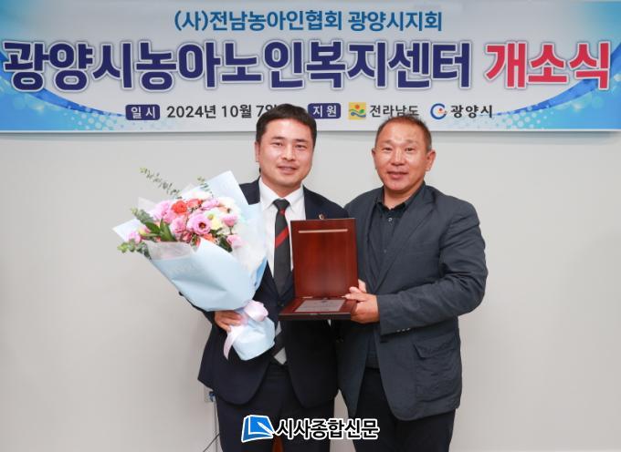 | ÀÓÇü¼® Àü³²µµÀÇ¿øÀÌ 10¿ù 7ÀÏ, ±¤¾ç½Ã³ó¾Æ³ëÀκ¹Áö¼¾ÅÍ °³¼Ò½Ä¿¡¼ (»ç)Àü³²³ó¾ÆÀÎÇùȸ ±èÀçö ±¤¾ç½ÃÁöȸÀå¿¡°Ô °¨»çÆÐ¸¦ ¹Þ°í ÇÔ²² ±â³ä»çÁøÀ» Âï°í ÀÖ´Ù. |