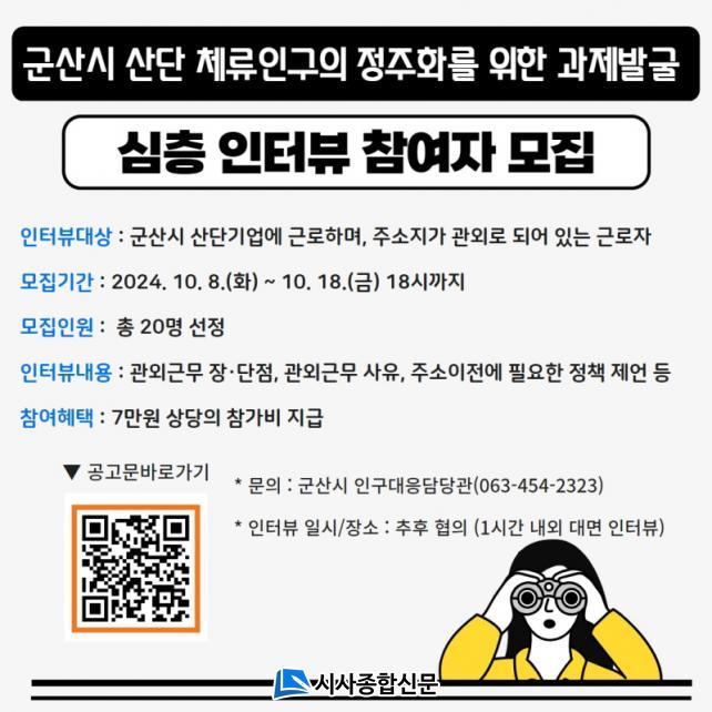 ½ÉÃþ ÀÎÅͺä´Â ±º»ê½Ã »ê´Ü ±â¾÷¿¡ ±Ù·ÎÇϸç ÁÖ¼ÒÁö°¡ °ü¿Ü·Î µÇ¾î ÀÖ´Â ±Ù·ÎÀÚ¸¦ ´ë»óÀ¸·Î, ÃÑ 20¸íÀ» ¸ðÁýÇÑ´Ù. ±â°£Àº 8ÀϺÎÅÍ 18ÀϱîÁöÀÌ´Ù. ÀÎÅͺä´Â ´ë»óÀÚ¿Í ÇùÀÇÇØ ÀÌ·ïÁö¸ç ¼Ò·®ÀÇ Âü°¡ºñµµ Áö±ÞµÈ´Ù.