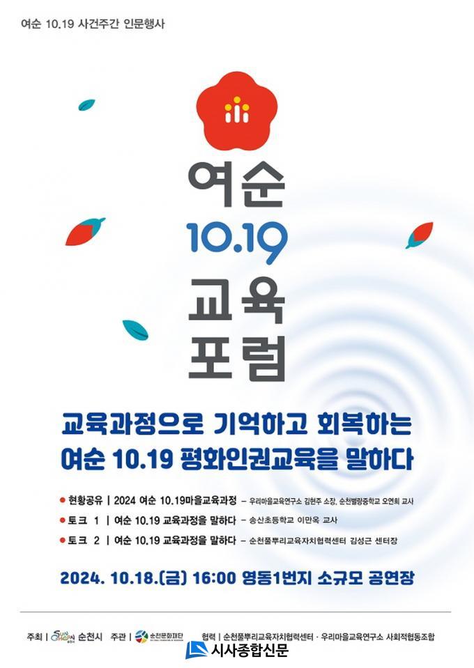 18ÀÏ ¿µµ¿1¹øÁö ¼Ò±Ô¸ð °ø¿¬Àå¿¡¼ ÁøÇàµÇ´Â ¿©¼ø»ç°Ç ±³À° Æ÷·³Àº ¿©¼ø 10.19 ¸¶À»±³À° °úÁ¤ÀÇ °³¹ß°ú ½ÇÇà »ç·Ê¸¦ °øÀ¯Çϰí Âü¿© Çлý°ú À¯Á·, ±³»çµéÀÇ À̾߱â·Î ±¸¼ºµÆ´Ù. ÀÌ¾î ¿ÀÈÄ 6½ÃºÎÅÍ´Â ¿©¼ø»ç°ÇÀÇ Èñ»ýÀÚ¸¦ Ã߸ðÇϱâ À§ÇÑ Ã߸ðÀü¾ßÁ¦°¡ À̾îÁø´Ù. À̹ø Ã߸ðÀü¾ßÁ¦¿¡¼´Â ½Ã¹ÎµéÀÌ Âü¿©ÇÏ´Â ¡®ÆòÈ¿°¿ø ¼øÃµ½Ã¹ÎÇÕâ´Ü¡¯À» ±¸¼ºÇÏ¿© ¿©¼øÃ¢ÀÛ À½¾Ç±Ø ¡®±×ÇØ 10¿ù¡¯À» ¼±º¸ÀδÙ.