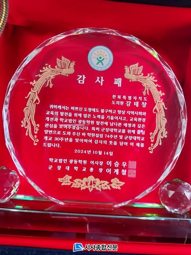 [½Ã»çÁ¾ÇսŹ® = ¿À½ÂÅà ±âÀÚ] ÀüºÏƯº°ÀÚÄ¡µµÀÇȸ ±âȹÇàÁ¤À§¿øÈ¸ °ÅÂâ ÀÇ¿ø(´õºÒ¾î¹ÎÁÖ´ç, ±º»ê1)ÀÌ Áö³ 14ÀÏ(¿ù) ±ºÀå´ëÇб³ ÃÑÀå(À̰èö ÃÑÀå)À¸·ÎºÎÅÍ °¨»çÆÐ¸¦ Àü´Þ¹Þ¾Ò´Ù.