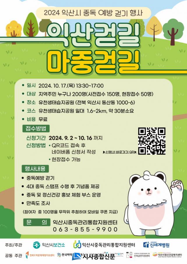 ÀÍ»ê½ÃÁßµ¶°ü¸®ÅëÇÕÁö¿ø¼¾ÅÍ(ÀÌÇÏ ¼¾ÅÍ)´Â ȸº¹ÀÚ¿Í °¡Á·, ÁֹΠµî 200¸íÀ» ´ë»óÀ¸·Î 'ÀÍ»ê°È±æ, ¸¶Á߰ȱæ'À» ÁøÇàÇÑ´Ù. À̹ø Çà»ç´Â Áßµ¶ ¿¹¹æ¿¡ µµ¿òÀÌ µÇ´Â °È±â¸¦ ÅëÇØ 4´ë Áßµ¶¿¡ ´ëÇÑ ÀνÄÀ» °³¼±Çϰí, ¿¹¹æÀÇ Á߿伺¿¡ ´ëÇÑ °ø°¨´ë¸¦ Çü¼ºÇϰíÀÚ ¸¶·ÃµÆ´Ù.