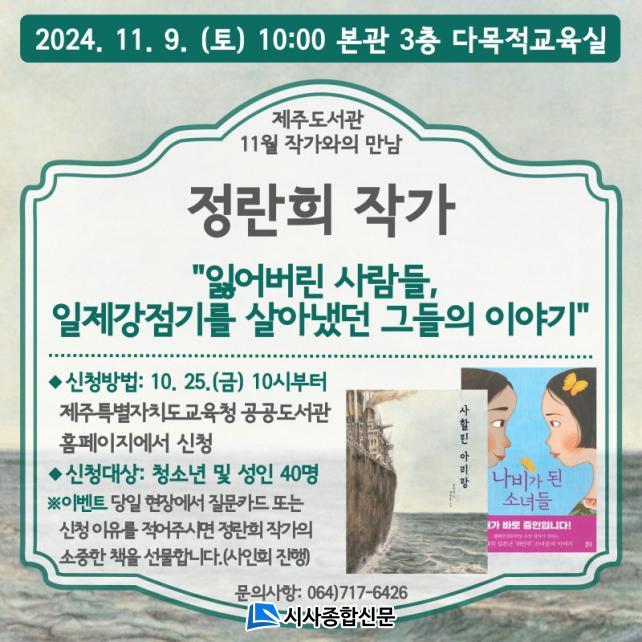 [½Ã»çÁ¾ÇսŹ® = °í¼º¹Î ±âÀÚ] Á¦ÁÖµµ¼°ü(°üÀå ÇѺÀ¼ø)Àº ´ÙÀ½ ´Þ 9ÀÏ Á¦ÁÖµµ¼°ü ´Ù¸ñÀû±³À°½Ç¿¡¼ û¼Ò³â°ú ¼ºÀÎÀ» ´ë»óÀ¸·Î 2015³â ÆòÈÀαǹ®ÇлóÀ» ¼ö»óÇÑ ÀÛ°¡¸¦ ÃÊûÇÏ¿©¡®Ã¥°ú »ç¶÷-Á¤¶õÈñ ÀÛ°¡¿ÍÀÇ ¸¸³²¡¯À» ¿î¿µÇÑ´Ù.