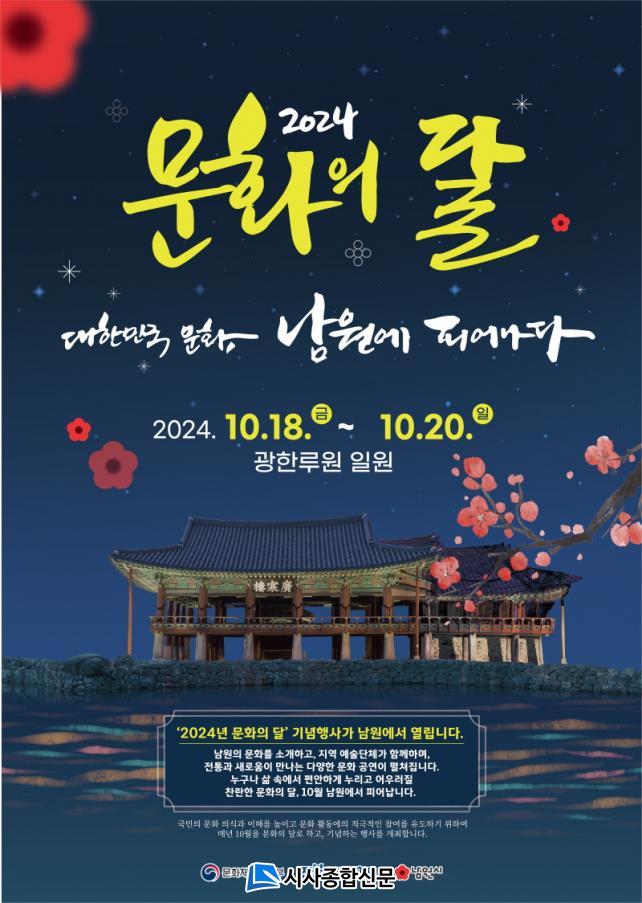 ¡®¹®ÈÀÇ ´Þ¡¯ ±â³äÇà»ç´Â Áö¿ª ¹®È¿¹¼úÀÇ Àúº¯À» ³ÐÈ÷°í °¢ Áö¿ªÀÇ Æ¯»öÀÖ´Â ¹®È¸¦ ¾Ë¸®±â À§ÇØ 2003³âºÎÅÍ ¸Å³â Àü±¹À» ¼øÈ¸ÇÏ¸ç °³ÃÖÇϰí ÀÖ´Ù. ¿ÃÇØ´Â ¡®´ëÇѹα¹ ¹®È, ³²¿ø¿¡¼ ÇǾ´Ù¡¯¸¦ ÁÖÁ¦·Î 10¿ù 18ÀϺÎÅÍ 20ÀϱîÁö ³²¿ø½Ã ±¤ÇÑ·ç¿ø ÀÏ´ë¿¡¼ °³ÃÖÇÑ´Ù.