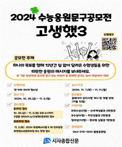 Á¢¼ö¹æ¹ýÀº 11¿ù 3ÀϱîÁö ±¸±ÛÆû QRÄÚµå(bit.ly/°í»ýÇß3°ø¸ðÀü)¸¦ ÅëÇØ ¿Â¶óÀÎÀ¸·Î Á¢¼öÇϰųª, 11¿ù 2ÀÏ 2024 µ¶¸³Æä½ºÆ¼¹ú(5.18 ¹ÎÁÖ±¤Àå) ÈÁ¤Ã»¼Ò³â¹®ÈÀÇÁý ¿î¿µ ºÎ½º¿¡¼ ÇöÀå Á¢¼ö·Î ÀÀ¸ð °¡´ÉÇÏ´Ù.