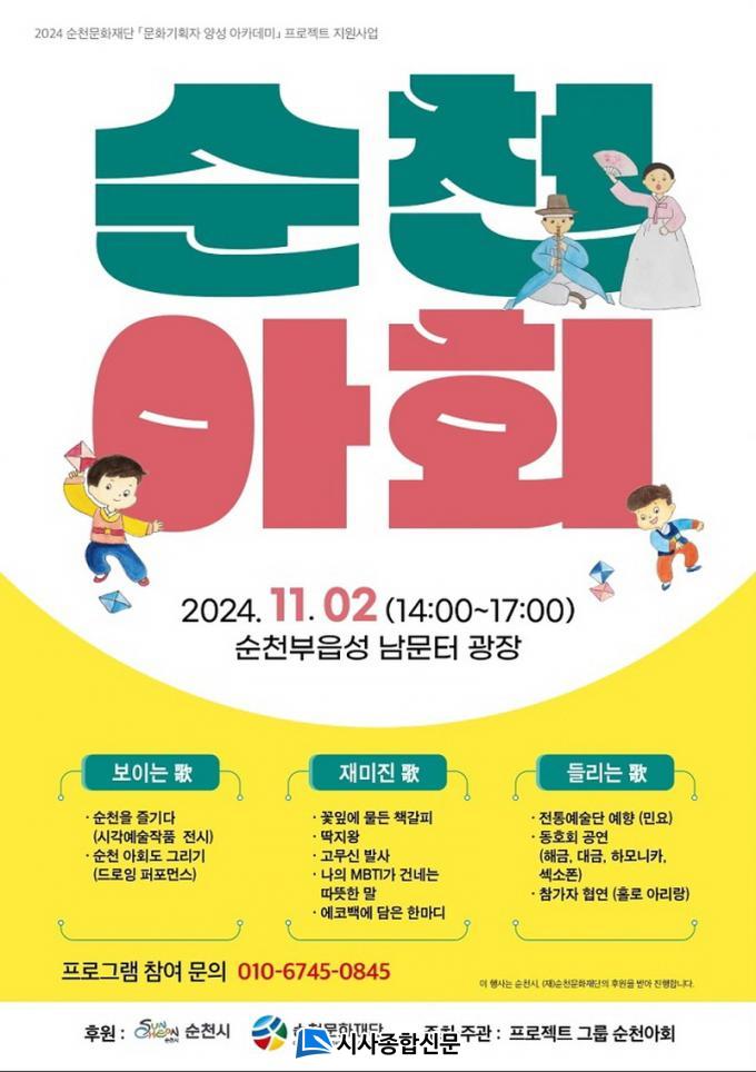 [½Ã»çÁ¾ÇսŹ® = Àå¹Î±Ô ±âÀÚ] (Àç)¼øÃµ¹®ÈÀç´Ü¿¡¼ ÁÖ°üÇÏ´Â ¡®¹®È±âȹÀÚ ¾ç¼º ¾ÆÄ«µ¥¹Ì¡¯ ½ÉȰúÁ¤ ¿ì¼öÆÀÀÌÀÚ Àü¹®°¡ °úÁ¤ ¼ö·áÆÀÀÇ ÇÁ·ÎÁ§Æ® ¡®¼øÃµ¾ÆÈ¸¡¯¿Í ¡®ÀºÇÏ¿¡ ¶ç¿î ºû°ú ¼Ò¸®¡¯°¡ ¿À´Â 2ÀÏ ¿ÀÈÄ 2½Ã ³²¹®ÅÍ ±¤Àå, ¿ÀÈÄ 3½Ã 30ºÐ ÀúÀü³ª´®ÅÍ¿¡¼ °¢°¢ ÁøÇàµÈ´Ù.