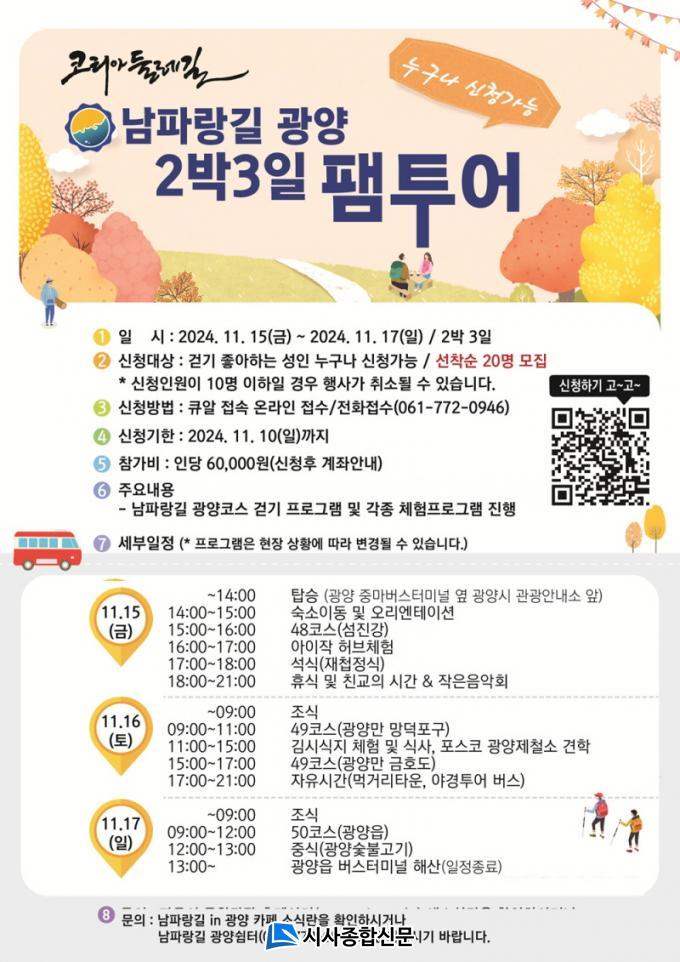 À̹ø Åõ¾î´Â ³²ÆÄ¶û±æ °È±â¸¦ ºñ·ÔÇØ ±è½Ã½ÄÁö ¹æ¹®, ±¤¾çÁ¦Ã¶¼Ò °ßÇÐ, ±¤¾ç ¸À üÇè µî ±¤¾çÀÇ °¡À»À» ¿À°¨À¸·Î Áñ±æ ¼ö ÀÖ´Â ´Ùä·Î¿î ÇÁ·Î±×·¥µé·Î ±¸¼ºµÆ´Ù. Åõ¾î ±â°£Àº ¿À´Â 15ÀϺÎÅÍ 17ÀϱîÁöÀÌ¸ç ¸ðÁý ±Ô¸ð´Â 20¸íÀÌ´Ù. °È±â¸¦ ÁÁ¾ÆÇÏ´Â ¼ºÀÎÀÌ¸é ´©±¸³ª Âü°¡ÇÒ ¼ö ÀÖ´Ù. Âü°¡ºñ´Â 6¸¸ ¿øÀ¸·Î ¼÷¹Ú°ú ÀçøÁ¤½Ä, ±¤¾çºÒ°í±â µî ±¤¾çÀÇ ´ëÇ¥ À½½ÄÀ» µÎ·ç ¸Àº¼ ¼ö ÀÖ´Â ±âȸ¸¦ Á¦°øÇÑ´Ù.