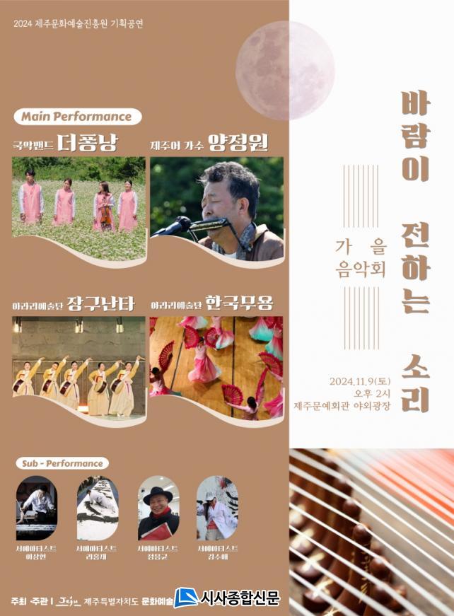 | Á¦ÁÖ¹®È¿¹¼úÁøÈï¿ø, Ưº°±âȹ °ø¿¬ °¡À»À½¾Çȸ ¹Ù¶÷ÀÌ ÀüÇÏ´Â ¼Ò¸® °ø¿¬ °³ÃÖ 9ÀÏ ¿ÀÈÄ 2½Ã ¹®¿¹È¸°ü ±¤Àå¿¡¼ ÁøÇàµÇ´Â ¾ß¿Ü À½¾Çȸ |