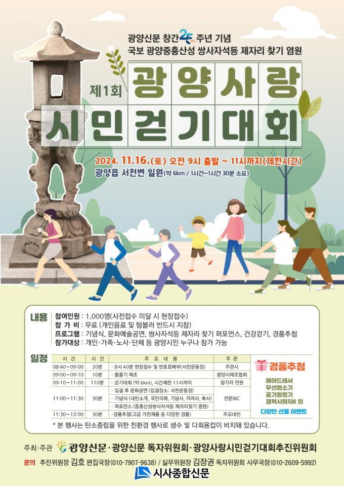 ±¤¾ç½Å¹®Àº ¿À´Â 11¿ù 16ÀÏ(Åä) ¿ÀÀü 9½Ã ±¤¾çÀ¾ ¼Ãµ¿îµ¿Àå¿¡¼ ³²³à³ë¼Ò, °¡Á·, Ä£±¸, µ¿·á µî 1000¸íÀÌ Âü°¡ÇÑ °¡¿îµ¥ ¡®Á¦1ȸ ±¤¾ç»ç¶û ½Ã¹Î°È±â´ëȸ¡¯°¡ °³ÃÖµÈ´Ù°í ¹àÇû´Ù.