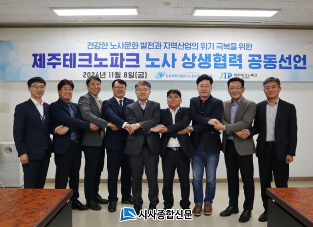 Á¦ÁÖÅ×Å©³ëÆÄÅ©(¿øÀå ¹®¿ë¼®)¿Í °ø°ø°úÇбâ¼ú¿¬±¸³ëµ¿Á¶ÇÕ Á¦ÁÖÅ×Å©³ëÆÄÅ©ÁöºÎ(ÁöºÎÀå ÁøÈñö)´Â 8ÀÏ ¿ÀÈÄ Á¦ÁÖº¥Ã³¸¶·ç ȸÀǽǿ¡¼ ÈÇÕ°ú ½Å·Ú¸¦ ¹ÙÅÁÀ¸·Î »ó»ýÇÏ´Â ³ë»ç¹®È¸¦ ¸¸µé±â À§ÇÑ ¡®³ë»ç »ó»ýÇù·Â °øµ¿¼±¾ð¹®¡¯À» ¹ßÇ¥Çß´Ù.