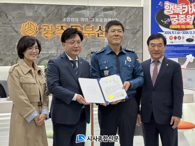[½Ã»çÁ¾ÇսŹ® = ¿À½ÂÅà ±âÀÚ] ±¤ÁÖµ¿ºÎ°æÂû¼´Â Áö³ 10¿ù 21ÀÏ ºñ´ë¸é »ç±â¸¦ ¿¹¹æÇÑ ±¤ÁÖµ¿ºÎ½ÅÇù ½É±âÈÆ Àü¹«¿¡°Ô Á¦79Áֳ⠰æÂûÀÇ ³¯À» ¸ÂÀÌÇÏ¿© °¨»çÀåÀ» Àü´ÞÇß´Ù.