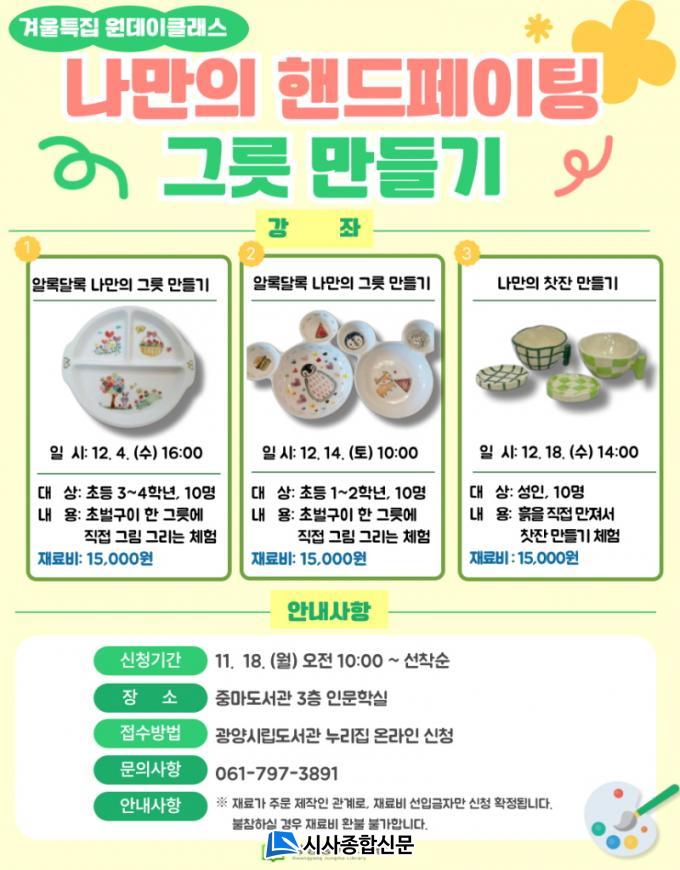 ÇÑÆí, ÇÁ·Î±×·¥ Âü¿© ½ÅûÀº 11¿ù 18ÀÏ(¿ù) ¿ÀÀü 10½ÃºÎÅÍ ±¤¾ç½Ã¸³µµ¼°ü ´©¸®Áý(http://lib.gwangyang.go.kr/)¿¡¼ ½Åû °¡´ÉÇÏ´Ù. ÀÚ¼¼ÇÑ »çÇ×Àº Á߸¶µµ¼°üÀ¸·Î ÀüÈ(¢Ï797-3891) Çϸé Ä£ÀýÇÑ ¾È³»¸¦ ¹ÞÀ» ¼ö ÀÖ´Ù.