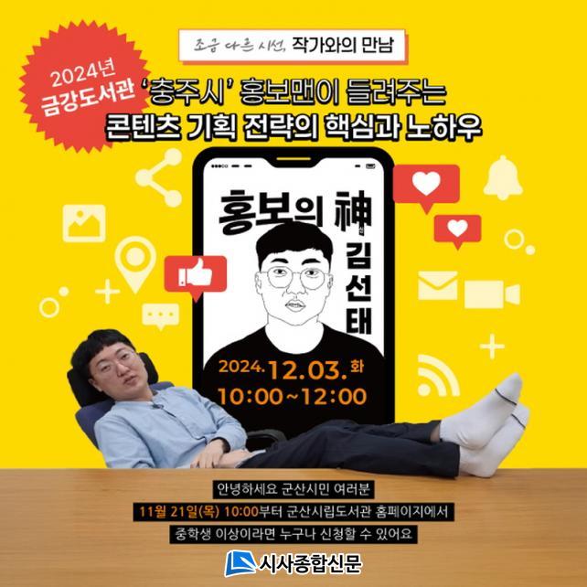 [½Ã»çÁ¾ÇսŹ® = ¿À½ÂÅà ±âÀÚ] ±º»ê½Ã ±Ý°µµ¼°ü¿¡¼´Â Á¶±Ý ´Ù¸¥ ½Ã¼±À¸·Î ¸¸³ª´Â Ưº°ÇÑ ÀÛ°¡¿ÍÀÇ ¸¸³², È«º¸ÀÇ ½Å ¡®ÃæÁֽà ȫº¸¸Ç¡¯ ±è¼±Å ÁÖ¹«°üÀÇ °¿¬ÀÌ 12¿ù 3ÀÏ(È) ¿ÀÀü 10½Ã¿¡ ¿¸± ¿¹Á¤ÀÌ´Ù.