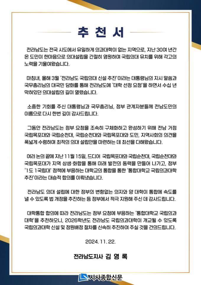 Àü³²µµ´Â Ãßõ¼¿¡¼ ¡°¿ÃÇØ 3¿ù, Á¤ºÎ¿¡¼ ´ëÅë·É°ú ´ë±¹¹Î´ãȸ¦ ÅëÇØ ¡®Àü¶ó³²µµ ±¹¸³ÀÇ´ë ½Å¼³ ÃßÁø¡¯À» ¹ßÇ¥Çϰí, Àü³²µµ¿¡ ´ëÇÐ ¼±Á¤À» ¿äûÇÏ¸é¼ ÀÇ´ë¼³¸³ÀÇ ±æÀÌ ¿·È´Ù¡±¸é¼ ¡°Á¤ºÎ ¿äû¿¡ µû¶ó °ÅÁ¡ ±¹¸³´ëÀÎ ±¹¸³¸ñÆ÷´ë¿Í ±¹¸³¼øÃµ´ë, µµ¹Î°ú Áö¿ª»çȸÀÇ ÀǰßÀ» Æø³Ð°Ô ¼ö·ÅÇϸç ÃÖÀûÀÇ Àǰú´ëÇÐ ¼³¸³¾ÈÀ» ¸¶·ÃÇϱâ À§ÇØ ÃÖ¼±À» ´ÙÇß´Ù¡±°í ¹àÇû´Ù.