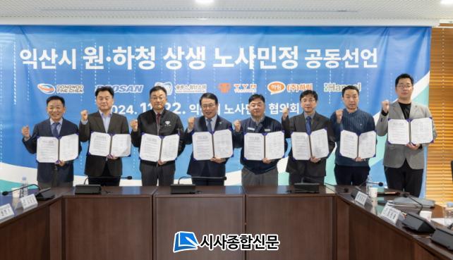 ÀÍ»ê½Ã´Â 22ÀÏ ½Ãû ´ëȸÀǽǿ¡¼ ³ë»ç¹ÎÁ¤ÇùÀÇȸ¸¦ °³ÃÖÇϰí ÁÖ¿ä ±â¾÷°ú ÇÔ²² 'ÀÍ»ê½Ã ¿øÇÏû »ó»ý ³ë»ç¹ÎÁ¤ °øµ¿¼±¾ð¹®'À» äÅÃÇß´Ù.