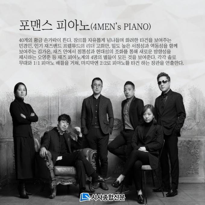 2ȸÂ÷ °ø¿¬ÀÇ ÁÖÀΰøÀÎ Æ÷¸Ç½º ÇǾƳë(4Men¡¯s Piano)´Â ±¹³» ÃÖÁ¤»ó±Þ ÇǾƴϽºÆ® 4ÀÎÀ¸·Î ±¸¼ºµÈ¡®´©±¸µµ Èä³» ³¾ ¼ö ¾ø´Â °Ç¹Ý À§ Ȳ±Ý ¼Õ°¡¶ô¡¯À̶ó°í ºÒ¸®´Â ÀçÁî ÇÇ¾Æ³ë ±×·ìÀ¸·Î, À̹ø °ø¿¬¿¡¼ ¸â¹ö °£ È·ÁÇÑ ÇÇ¾Æ³ë ¹èÆ²·Î ¡®Spain¡¯, ¡®Shape of My Heart¡¯, ¡®The Girl from Ipanema¡¯ µîÀÇ ¸í°îÀ» ÇÇ¾Æ³ë ¾Ó»óºí·Î ÀçÇØ¼®ÇÒ ¿¹Á¤ÀÌ´Ù.