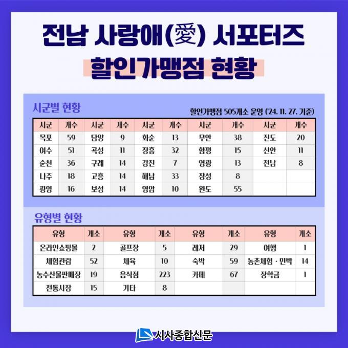 ÇöÀç Àü³² »ç¶û¾Ö ¼Æ÷ÅÍÁî ÇÒÀΰ¡¸ÍÁ¡Àº ¸ñÆ÷ 59°³¼Ò, ¿Ïµµ 55°³¼Ò, ¿©¼ö 51°³¼Ò µî Áö¿ªº°·Î °í¸£°Ô ºÐÆ÷ÇØ ÀÖ´Ù. ¾÷Á¾º°·Î´Â À½½ÄÁ¡ 223°³¼Ò, Ä«Æä 67°³¼Ò, ¼÷¹Ú 59°³¼Ò, üÇ衤°ü¶÷ 52°³¼Ò, ÀüÅë½ÃÀå 15°³¼Ò µîÀ¸·Î Àü³²ÀÇ Çʼö ¿©ÇàÁö¿Í ´ëÇ¥ À½½ÄÁ¡À» Æ÷ÇÔÇϰí ÀÖ´Ù.