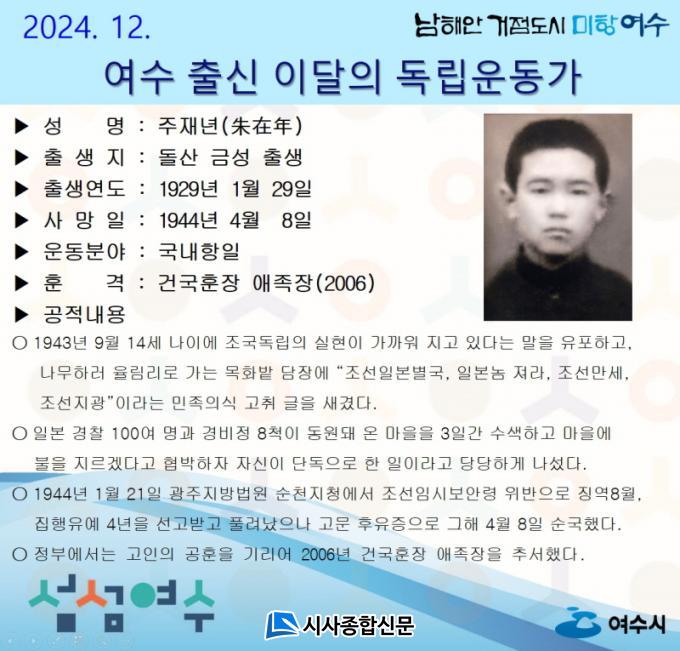 | ¿©¼ö½Ã, 12¿ùÀÇ µ¶¸³¿îµ¿°¡ µ¹»ê ±Ý¼º Å»ý ¡®ÁÖÀç³â ¼±»ý¡¯ ¼±Á¤ |