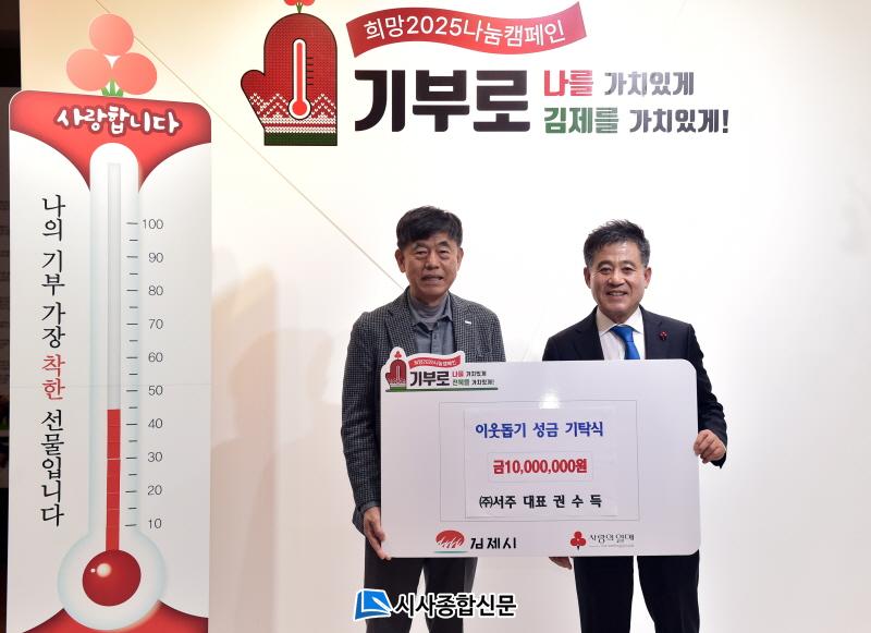 [½Ã»çÁ¾ÇսŹ® = ¿À½ÂÅà ±âÀÚ] ±èÁ¦½Ã(½ÃÀå Á¤¼ºÁÖ)´Â ¿äÃ̵¿¿¡ À§Ä¡ÇÑ ¢ß¼ÁÖ¿ìÀ¯(´ëÇ¥ ±Ç¼öµæ)°¡ 9ÀÏ, ¼Ò¿ÜµÈ ÀÌ¿ôÀ» µ½±â À§ÇØ ÀÌ¿ôµ½±â ¼º±Ý 1õ¸¸ ¿øÀ» Àü´ÞÇϸç 'Èñ¸Á 2025 ³ª´® Ä·ÆäÀÎ'¿¡ µ¿ÂüÇß´Ù°í ¹àÇû´Ù.