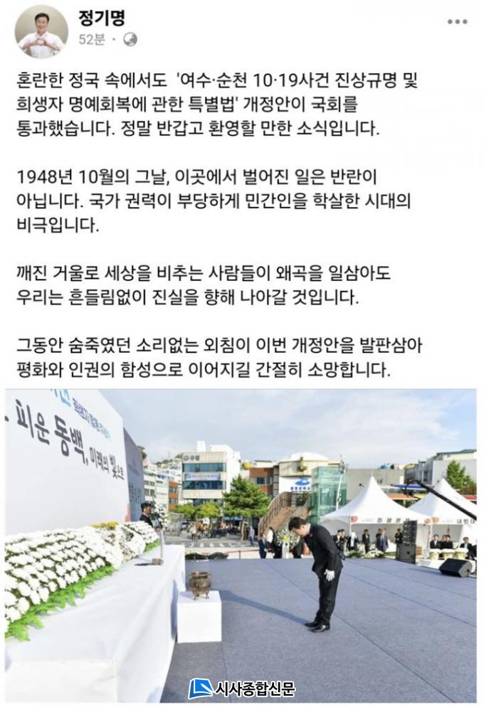 [½Ã»çÁ¾ÇսŹ® = ¿À½ÂÅà ±âÀÚ] Á¤±â¸í ¿©¼ö½ÃÀåÀÌ 11ÀÏ °³ÀÎ SNS(ÆäÀ̽ººÏ) °èÁ¤À» ÅëÇØ ¡®¿©¼ö¡¤¼øÃµ 10¡¤19 »ç°Ç Áø»ó±Ô¸í ¹× Èñ»ýÀÚ ¸í¿¹È¸º¹¿¡ °üÇÑ Æ¯º°¹ý¡¯ °³Á¤¾ÈÀÇ ±¹È¸ º»È¸ÀÇ Åë°ú¸¦ ȯ¿µÇß´Ù.