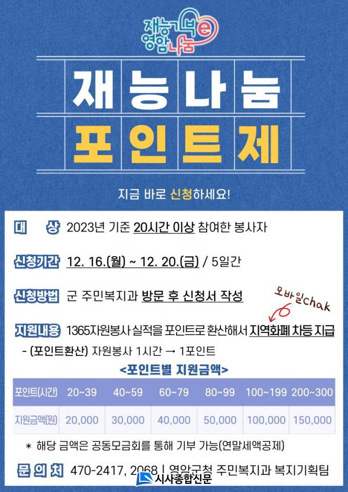 ÀÚ¿øºÀ»ç Ȱµ¿ ½Ã°£À» Æ÷ÀÎÆ®·Î ÀüȯÇϰí, Áö¿ªÈÆó·Î Áö±ÞÇÏ´Â ³»¿ëÀ¸·Î ÀÚ¿øºÀ»ç¶ó´Â »çȸÀû °¡Ä¡¸¦ âÃâÇϰí, Áö¿ª°æÁ¦ Ȱ¼ºÈ¿¡µµ ±â¿©ÇÑ´Ù´Â ÃëÁö¿¡¼´Ù. À̹ø Áö¿ªÈÆó Áö±Þ¿¡´Â ¡®1365 ÀÚ¿øºÀ»ç Æ÷ÅС¯ »çÀÌÆ®¿¡ 2023³â¿¡ 20½Ã°£ ÀÌ»ó ÀÚ¿øºÀ»çÇÑ ±â·ÏÀÌ ÀÖ´Â ¿µ¾Ï±º¹ÎÀÌ Âü¿©ÇÒ ¼ö ÀÖ´Ù.