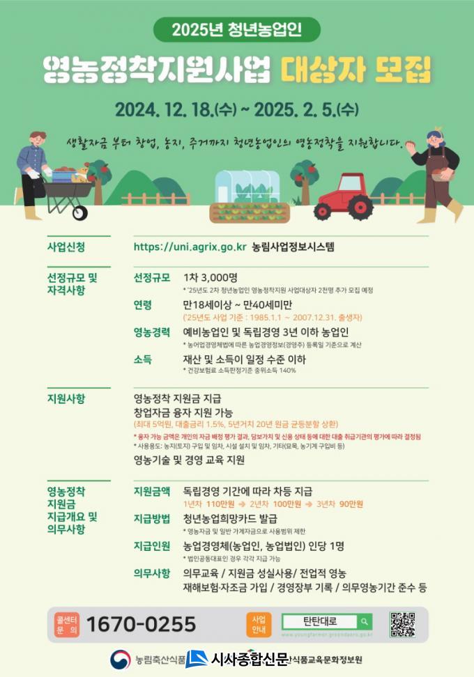 û³â³ó¾÷ÀÎ ¿µ³óÁ¤ÂøÁö¿ø»ç¾÷Àº »ç¾÷¿¬µµ ±âÁØ ¸¸ 18¼¼ ÀÌ»ó~¸¸ 40¼¼ ¹Ì¸¸À¸·Î, µ¶¸³°æ¿µ 3³â ÀÌÇÏ(µ¶¸³°æ¿µ ¿¹Á¤ÀÚ Æ÷ÇÔ)ÀÇ Ã»³â ³ó¾÷ÀÎÀÌ ½ÅûÇÒ ¼ö ÀÖ´Ù. ÃÖÁ¾ ¼±Á¤µÈ û³â ³ó¾÷ÀÎÀº ÃÖ´ë 3³â°£ ¸Å¿ù 90¸¸ ¿ø¿¡¼ 110¸¸ ¿øÀÇ ¿µ³óÁ¤ÂøÁö¿ø±ÝÀ» ¹Þ°Ô µÈ´Ù.