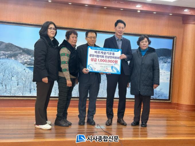 [½Ã»çÁ¾ÇսŹ® = Àå¹Î±Ô ±âÀÚ] ±¤¾ç½Ã´Â Áö³ 19ÀÏ ¹Ù¸£°Ô»ì±â¿îµ¿±¤¾ç½ÃÇùÀÇȸ Áø»ó¸éÀ§¿øÈ¸(ȸÀå ±è¿ë»ý)°¡ ÈÄ¿ø±Ý 100¸¸ ¿øÀ» Áø»ó¸éÁö¿ª»çȸº¸ÀåÇùÀÇü(°ø°øÀ§¿øÀå À̺´³², ¹Î°£À§¿øÀå ¿ìÁ¦ºÀ)¿¡ ÁöÁ¤ ±âŹ Çß´Ù°í 20ÀÏ ¹àÇû´Ù.