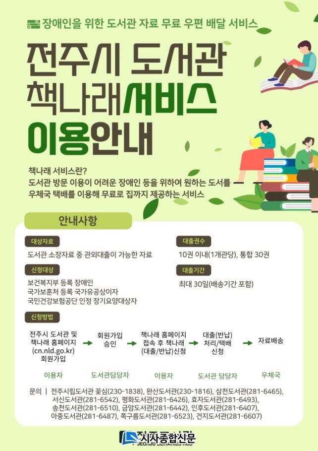 ÀüÁֽô µµ¼°ü ¹æ¹® ÀÌ¿ëÀÌ ¾î·Á¿î Àå¾ÖÀΰú ±¹°¡À¯°ø»óÀÌÀÚ, Àå±â¿ä¾ç´ë»óÀÚ¿¡°Ô ¿øÇÏ´Â ÀڷḦ Áý±îÁö ¹«·á·Î ¹è´ÞÇØ ÁÖ´Â ¡®Ã¥³ª·¡ ¼ºñ½º¡¯¸¦ ³»³âºÎÅÍ´Â ±âÁ¸ 6°³ µµ¼°ü¿¡¼ 12°³ ¸ðµç µµ¼°üÀ¸·Î È®´ëÇØ ¿î¿µÇÒ °èȹÀ̶ó°í 23ÀÏ ¹àÇû´Ù.