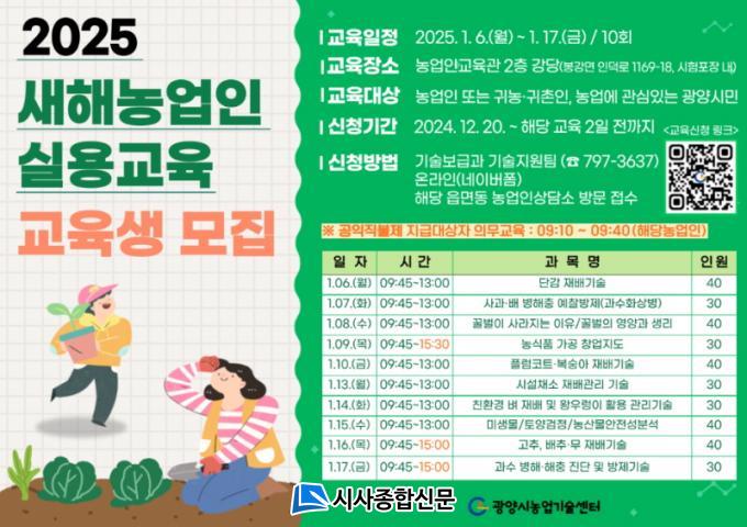 ±³À°±â°£Àº 1¿ù 6ÀÏ(¿ù)ºÎÅÍ 1¿ù 17ÀÏ(±Ý)±îÁöÀÌ¸ç ±³À° Àå¼Ò´Â ½ÃÇè Æ÷Àå ³» ±¤¾ç½Ã ³ó¾÷Àα³À°°ü 2Ãþ °´çÀÌ´Ù. °¨, º, Ç÷³ÄÚÆ®¡¤º¹¼þ¾Æ(ÇÙ°ú·ù), °¡°ø â¾÷, ¾çºÀ µî 10°³ ǰ¸ñÀÇ Àü¹®°úÁ¤À» ¿î¿µÇÒ ¿¹Á¤À¸·Î, ±³À° Àü °øÀÍÁ÷ºÒÁ¦ Áö±Þ ´ë»ó ³ó¾÷Àο¡ ´ëÇÑ Àǹ«±³À°À» º´ÇàÇÒ °èȹÀÌ´Ù.