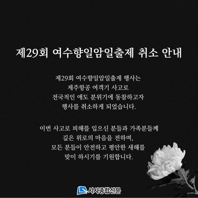 | ¿©¼ö½Ã, Á¦29ȸ ¿©¼öÇâÀϾÏÀÏÃâÁ¦ Çà»ç Ãë¼Ò Á¦ÁÖÇ×°ø ¿©°´±â »ç°í¿¡ µû¸¥ Èñ»ýÀÚ ¾Öµµ µ¿Âü |