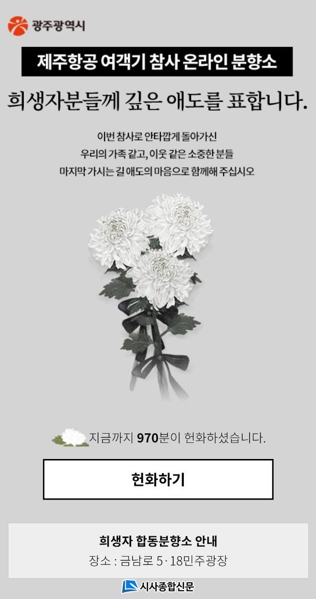 ±¤ÁÖ±¤¿ª½Ã(½ÃÀå °±âÁ¤)´Â 31ÀÏ Á¦ÁÖÇ×°ø ¿©°´±â Âü»ç Èñ»ýÀÚµéÀ» ¿Â¶óÀÎ °ø°£¿¡¼ Ã߸ðÇÒ ¼ö ÀÖµµ·Ï ±¤Áֽà ´©¸®Áý¿¡ ¡®»çÀ̹öºÐÇâ¼Ò¡¯¸¦ °³¼³, ¿î¿µÇϰí ÀÖ´Ù.