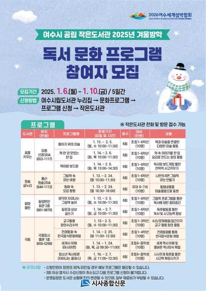 Âü¿© Èñ¸ÁÀÚ´Â ¿©¼ö½Ã¸³µµ¼°ü ´©¸®Áý(yslib.yeosu.go.kr)¿¡¼ ¿Â¶óÀÎ ½ÅûÇϰųª ÇØ´ç ÀÛÀºµµ¼°üÀ¸·Î ÀüÈ ¶Ç´Â ¹æ¹® ½ÅûÇÏ¸é µÇ¸ç, °¢ ÇÁ·Î±×·¥Àº 10¸í¾¿ ¼±Âø¼ø ¸¶°¨µÈ´Ù.