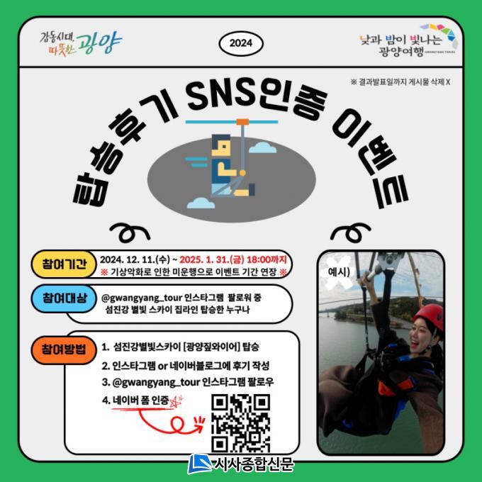 ÃÖ´ë 50¸¸ ¿ø »ó´çÀÇ »óǰÀ» ÁõÁ¤ÇÏ´Â À̺¥Æ®¿¡ Âü¿©ÇÏ·Á¸é ±¤¾ç°ü±¤ ÀνºÅ¸¸¦ ÆÈ·Î¿ìÇϰí ÀÚ½ÅÀÇ SNS Èı⸦ ÇöÀåÀÇ ¹è³Ê ¶Ç´Â ±¤¾ç ¹®È°ü±¤ ´©¸®Áý ÆË¾÷âÀÇ QRÄڵ带 ÅëÇØ ÀÎÁõÇÏ¸é µÈ´Ù. Âü¿©ÀÚ¿¡°Ô´Â Æò°¡ ±âÁØ¿¡ µû¶ó 1µî, 2µî, 3µî °¢ 1¸í¿¡°Ô 50¸¸ ¿ø, 30¸¸ ¿ø, 20¸¸ ¿ø »ó´çÀÇ »óǰÀ» °¢°¢ ÁõÁ¤Çϰí Ãß÷À» ÅëÇØ 50¸í¿¡°Ô 1¸¸ ¿ø »óǰ±ÇÀ» Á¦°øÇÑ´Ù.