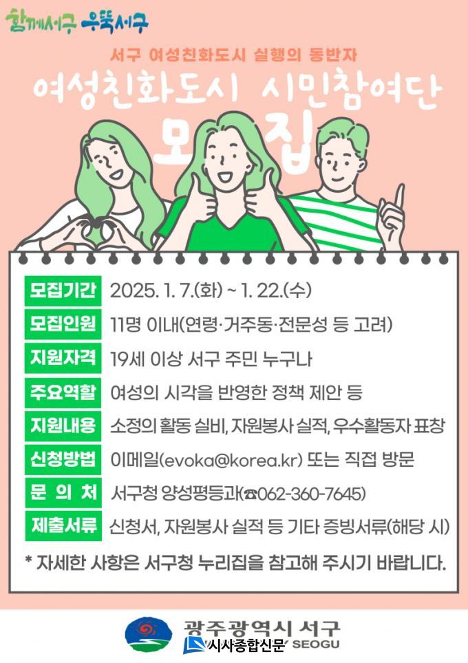 ¸ðÁýÀοøÀº 11¸í À̳»·Î ¿©¼ºÄ£È, ¾ç¼ºÆòµî Á¤Ã¥¿¡ ´ëÇÑ °ü½ÉÀÌ ¸¹Àº ¼±¸ ÁֹΠ´©±¸³ª °¡´ÉÇÏ¸ç ½Åû¼¸¦ ÀÛ¼ºÇØ ¼±¸Ã» ¾ç¼ºÆòµî°ú·Î ¹æ¹®Çϰųª À̸ÞÀÏ(evoka@korea.kr)·Î Á¦ÃâÇÏ¸é µÈ´Ù. ¾Æ¿ï·¯ ½Ã¹ÎÂü¿©´ÜÀº °¢Á¾ ¿ª·®±³À°°ú ¿öÅ©¼ó µî¿¡ Âü¿©ÇÒ ¼ö ÀÖÀ¸¸ç ¼ÒÁ¤ÀÇ È°µ¿ ½Çºñ Áö±Þ, ÀÚ¿øºÀ»ç Ȱµ¿½Ã°£ ÀÎÁ¤, Ȱµ¿ ¿ì¼öÀÚ Ç¥Ã¢ µîÀÇ Àμ¾Æ¼ºê°¡ Á¦°øµÈ´Ù.
