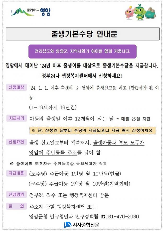 Àü¶ó³²µµ¿Í ¿µ¾Ï±ºÀÇ Ãâ»ý±âº»¼ö´çÀº ¼Òµæ ¼öÁذú °ü°è¾øÀÌ 2024³â ÀÌÈÄ Ãâ»ýÇØ Àü³²¿¡ Ãâ»ý½Å°í¸¦ ÇÏ°í ¿µ¾Ï±º¿¡ ÁÖ¼Ò¸¦ µÐ 1¼¼ ¾Æµ¿¿¡°Ô Áö±ÞµÈ´Ù. ´Ü, ¾ÆÀÌ¿Í º¸È£ÀÚ ¸ðµÎ Ãâ»ý½Å°íÀÏ ±âÁØ ¿µ¾Ï±º¿¡ Áֹεî·ÏÀ» µÎ°í °è¼Ó »ì°í ÀÖ¾î¾ß ÇÑ´Ù.