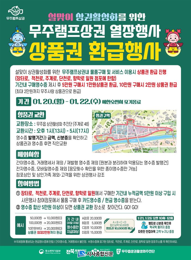 »óǰ±Ç ȯ±ÞÇà»ç´Â ¹«ÁÖ·¥ÇÁ»ó±Ç ³»(¹«ÁÖÀ¾ ÀåÅÍ·Î, Àûõ·Î, ÁÖ°è·Î, ´Üõ·Î, ÇâÇзÎ) Á¡Æ÷¿¡¼ ¹°Ç°±¸¸Å ¹× ¼ºñ½º¸¦ ÀÌ¿ëÇÑ °í°´ Áß ±â°£ ³»(1.20.~22.) ¿µ¼öÁõ ÇÕ»ê 5¸¸ ¿ø ÀÌ»óÀÌ¸é ¹«ÁÖ»óǰ±ÇÀ» Áö±Þ(ÃÖ´ë 2¸¸ ¿ø)ÇÏ´Â °ÍÀ¸·Î,