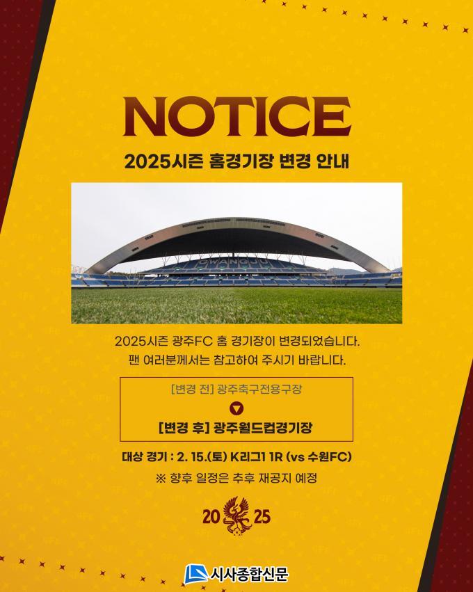 ±¤ÁÖ´Â ³»´Þ 15ÀÏ¿¡ ÆîÃÄÁö´Â 2025½ÃÁð K¸®±× Ȩ °³¸·Àü(VS ¼ö¿øFC) °æ±â¸¦ ACLE Ȩ±¸ÀåÀ¸·Î »ç¿ëÇϰí ÀÖ´Â ±¤ÁÖ¿ùµåÄŰæ±âÀåÀ¸·Î º¯°æÇÑ´Ù°í ¹àÇû´Ù.