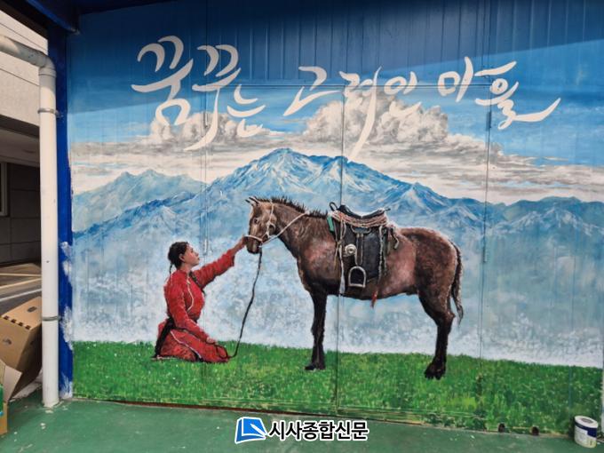 ³ôÀº õ»ê»ê¸ÆÀ» ¹è°æÀ¸·Î ±×·ÁÁø º®È´Â ÇÑ ¸¶¸®ÀÇ ¸»°ú °í·ÁÀÎ ¿©¼ºÀÇ ¸ð½ÀÀ» ´ã°í ÀÖ´Ù. º®ÈÀÇ Á¦¸ñÀº ¡°¿ì¸° ¾î¸Ó´ÏÀÇ ³ª¶ó °í±¹À¸·Î ¹Ýµå½Ã µ¹¾Æ°¡¾ß ÇÑ´Ù¡±·Î, ÀÌ´Â °í·ÁÀÎÀÇ °í±¹¿¡ ´ëÇÑ ÇѾø´Â ±×¸®¿ò°ú Èñ¸ÁÀ» Ç¥ÇöÇϰí ÀÖ´Ù.