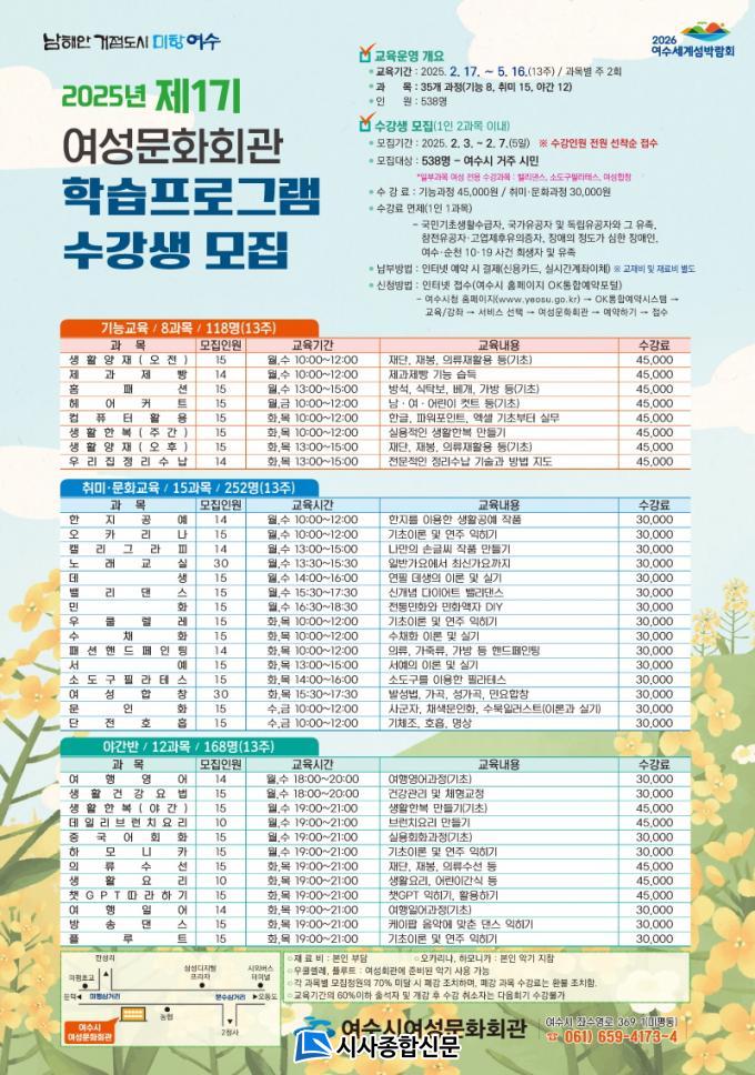 ¸ðÁý °ú¸ñÀº ¡ã¾çÀç, Á¦°úÁ¦»§, ȨÆÐ¼Ç µî ±â´É¹Ý 8°³ ¡ã¹ÎÈ, ¼Òµµ±¸ ÇʶóÅ×½º, ¿ÀÄ«¸®³ª µî Ãë¹Ì¹Ý 15°³ ¡ãÀÇ·ù¼ö¼±, »ýȰ¿ä¸®, ÇÃ·çÆ® µî ¾ß°£¹Ý 12°³ µî 35°³ °ú¸ñÀÌ´Ù. ÀÌ Áß º§¸®´í½º, ¼Òµµ±¸ ÇʶóÅ×½º, ¿©¼ºÇÕâ µî 3°³ °ú¸ñÀº ¿©¼º Àü¿ë ¼ö° °ú¸ñÀÌ´Ù.