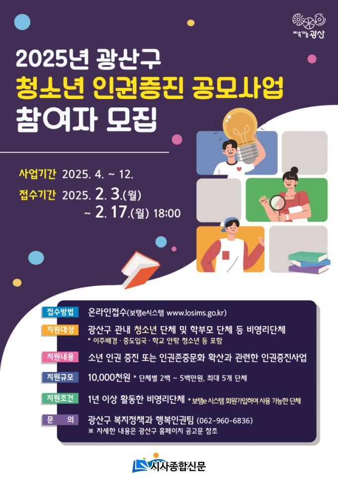 ±¤»ê±¸´Â 17ÀϱîÁö Áö¿ª¿¡¼ Ȱµ¿Çϴ û¼Ò³â ´Üü, Çкθð ´Üü µîÀ» ´ë»óÀ¸·Î »ç¾÷¿¡ Âü¿©ÇÒ ´Üü¸¦ °ø°³ ¸ðÁýÇÑ´Ù.
