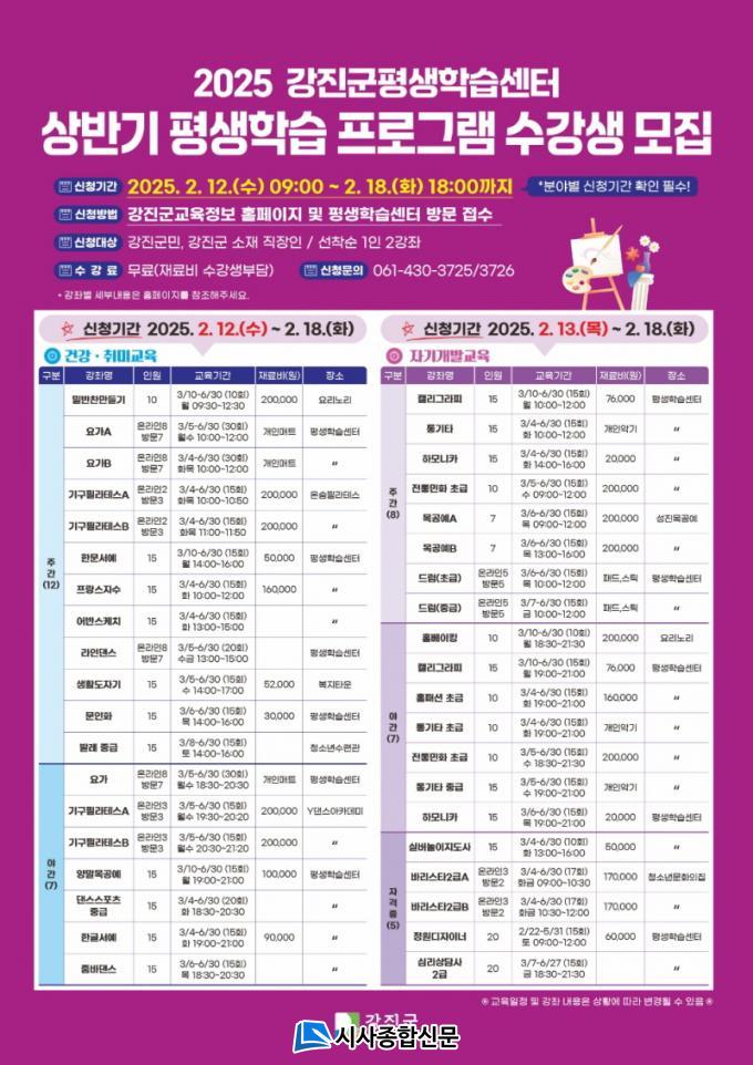ÀÚ¼¼ÇÑ »çÇ×Àº °Áø±º ȨÆäÀÌÁö(www.gangjin.go.kr) °í½Ã‧°ø°í ¶Ç´Â ±³À°Á¤º¸ ȨÆäÀÌÁö(Æò»ýÇнÀ-°Á½Åû)¸¦ Âü°íÇϰųª, Ãѹ«°ú ±³À°±³·ùÆÀ(061-430-3725)¿¡ ¹®ÀÇÇÏ¸é µÈ´Ù.