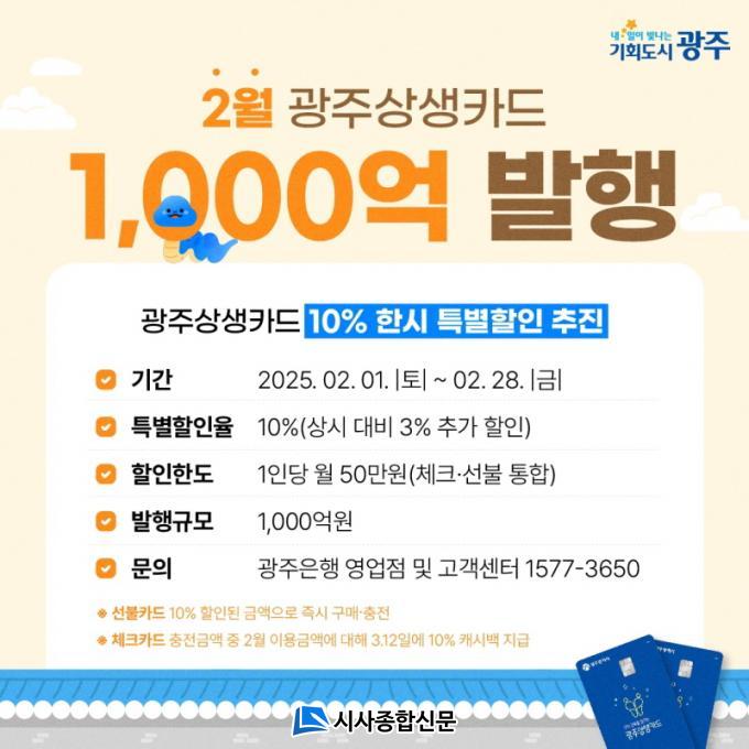 ±¤ÁÖ±¤¿ª½Ã(½ÃÀå °±âÁ¤)´Â ½Ãºñ 100¾ï¿øÀ» ÅõÀÔÇØ 2¿ù ÇÑ ´Þ°£ ±¤ÁÖ»ó»ýÄ«µå 10% Ưº°ÇÒÀÎÀ» ¿¬Àå ½ÃÇàÇÑ´Ù. ±âÁ¸ ±¤ÁÖ»ó»ýÄ«µå ÇÒÀÎÀ²Àº 7%´Ù.